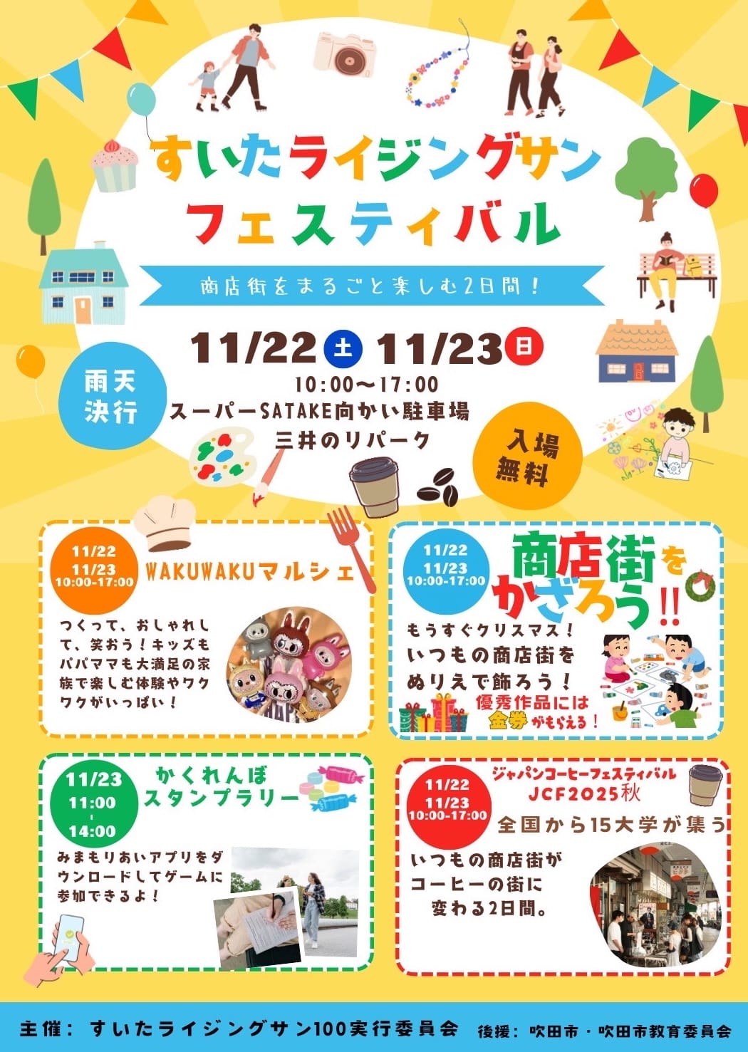 『すいたライジングサン』は、2024 年に創立 100 周年を迎えた吹田市旭通商店街を中心にJR吹田駅周辺の多数の商店街に属する商業者と、地元大学、企業が連携し、JR吹田駅周辺の地域活性化 を目的としたイベントです。商業者と大学生、地元企業で構成された「すいたライジングサン100実行委員会」が企画・運営しています。 場所・時間 WakuWakuマルシェ 11/22 11/23 11:00~16:00
